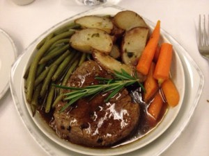I pre-ordered „Pan-fried fillet of beef in three peppercorn sauce with garden vegetables and roasted potatoes“.